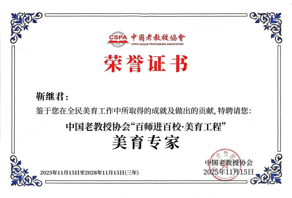 靳继君的入选,是我校离退休教师“离岗不离责、退休不褪色”的生动写照,也彰显了学校深厚的美育底蕴与银龄人才的持续活力。学校及老教授协会将继续搭建平台、拓展渠道,支持老同志聚焦立德树人、文化传承,将专业优势转化为服务学校与社会发展的实际成效,共同助力高质量发展。